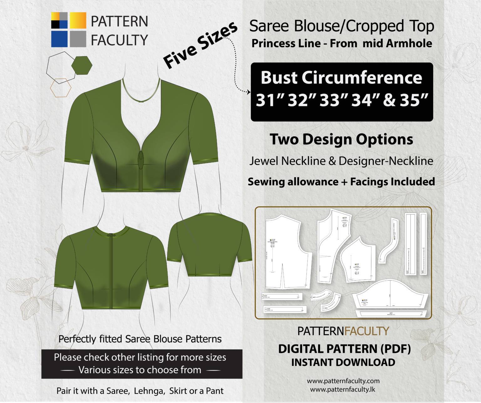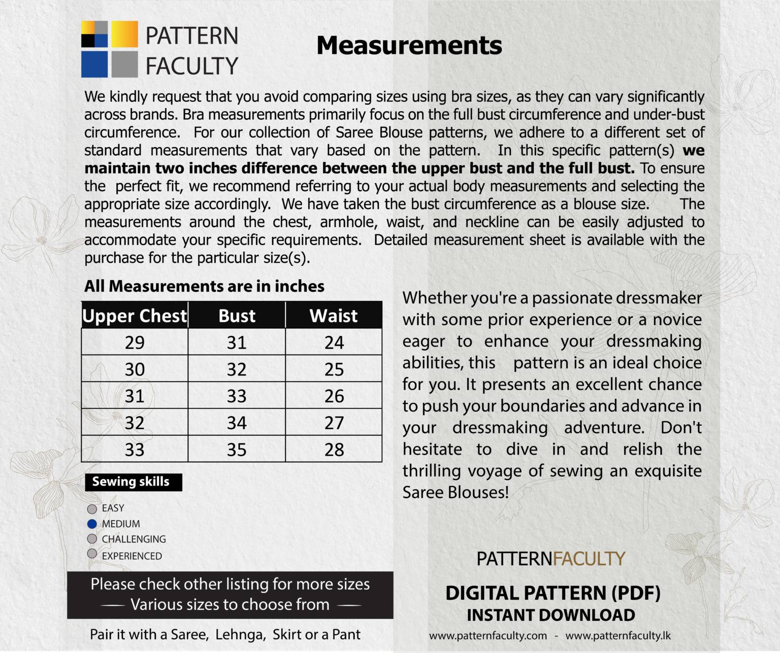 IMPORTANT MEASUREMENTS: This pattern set is drafted with a two-inch difference between the upper bust and bust circumference. Before making a purchase, we kindly request you to ensure accurate measurements. Please measure your chest circumference, full bust circumference, and the waist circumference. Once you have taken these measurements, compare them with the measurement chart provided below. If your body measurements do not align with any of these sizes mentioned below, kindly consider checking out alternative size group options available here. We have sizes from Bust circumference 31 to 55 available in this range.
