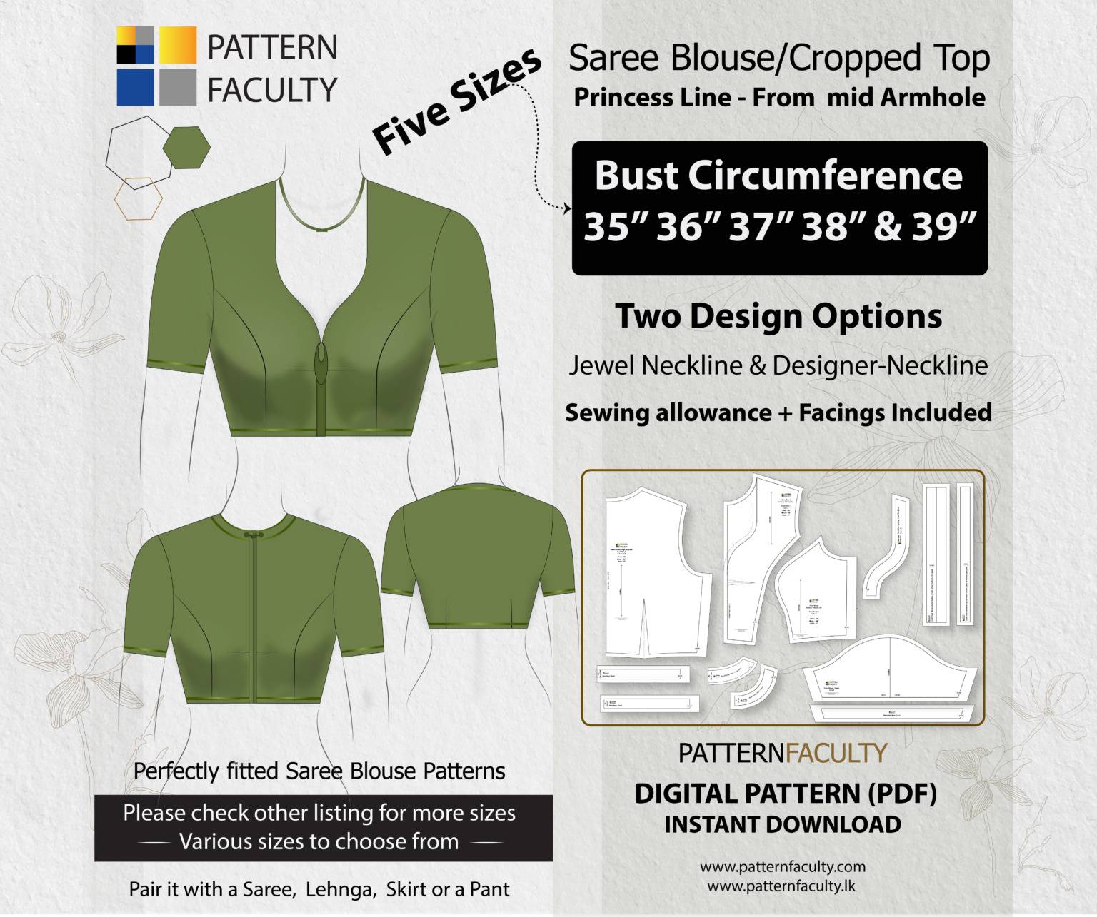 Elevate your fashion with our PDF Digital Pattern for a Saree Blouse featuring a stylish High neckline and an elegant Princess Line cut that flows from the mid-armhole to the waist. This pattern is designed to fit a range of sizes, accommodating bust circumferences 35, 36, 37, 38 and 39. inches. You can customize the blouse with a classic Jewel Neckline, a modern designer Neckline or give your own neckline design. The blouse harmoniously complements sarees, lehngas, skirts, or pants, enabling you to effortlessly fashion high-necked blouses that infuse a hint of sophistication into any attire. Feel free to embellish your saree blouse with piping, sequins, or any other decorative elements to elevate its beauty even further.