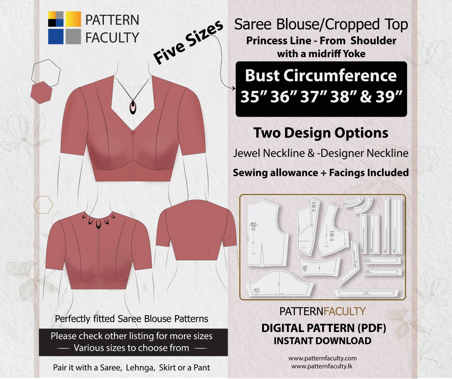 Elevate your fashion with our PDF Digital Pattern for a Saree Blouse featuring a stylish High neckline and an elegant Princess Line cut that flows from the mid-shoulder to the under bust and finishing with a beautiful midriff yoke. This pattern is designed to fit a range of sizes, accommodating bust circumferences 35, 36, 37, 38 & 39 inches. You can customize the blouse with a classic Jewel Neckline, a modern designer Neckline or give your own neckline design. The blouse harmoniously complements sarees, lehngas, skirts, or pants, enabling you to effortlessly fashion high-necked blouses that infuse a hint of sophistication into any attire. Feel free to embellish your saree blouse with piping, sequins, or any other decorative elements to elevate its beauty even further.