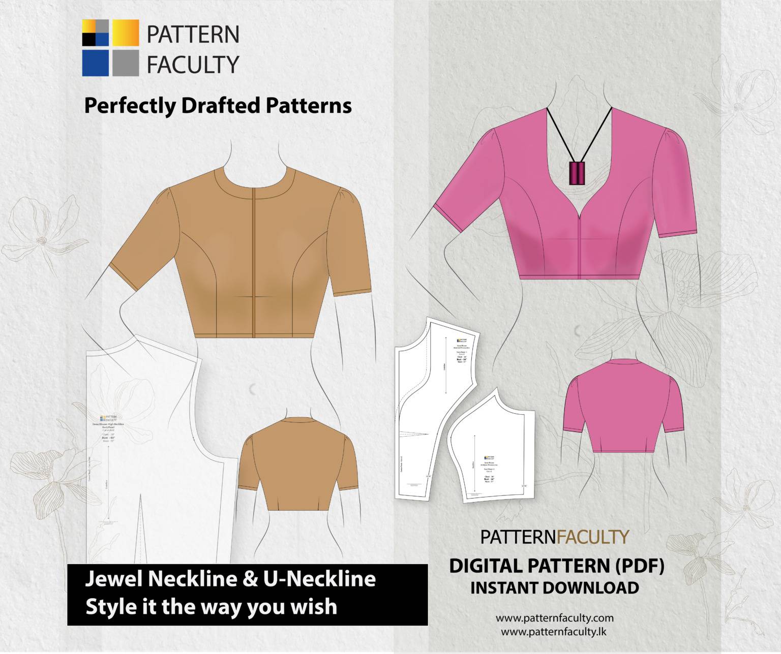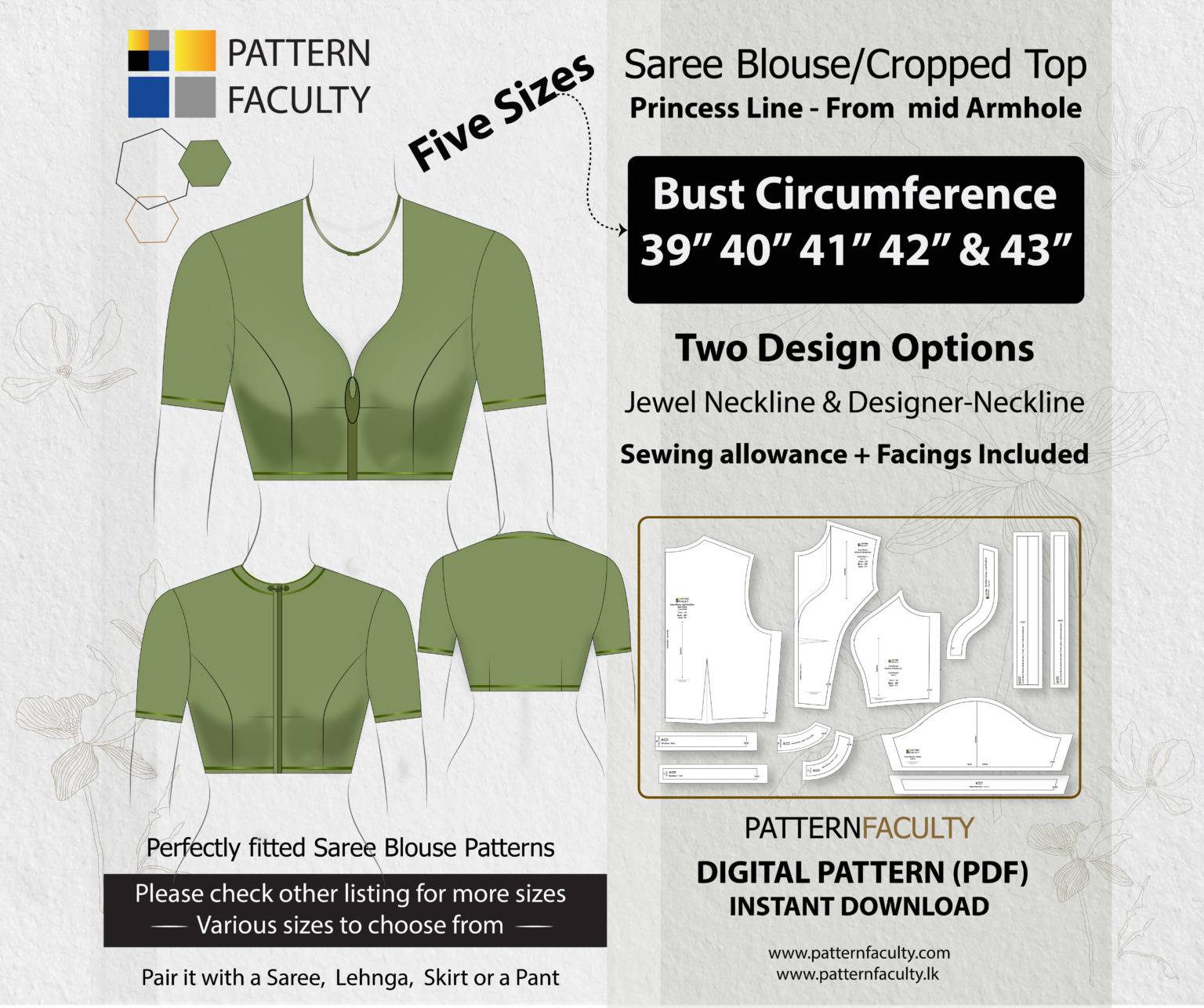 Elevate your fashion with our PDF Digital Pattern for a Saree Blouse featuring a stylish High neckline and an elegant Princess Line cut that flows from the mid-armhole to the waist. This pattern is designed to fit a range of sizes, accommodating bust circumferences 39, 40, 41, 42 and 43. inches. You can customize the blouse with a classic Jewel Neckline, a modern designer Neckline or give your own neckline design. The blouse harmoniously complements sarees, lehngas, skirts, or pants, enabling you to effortlessly fashion high-necked blouses that infuse a hint of sophistication into any attire. Feel free to embellish your saree blouse with piping, sequins, or any other decorative elements to elevate its beauty even further.