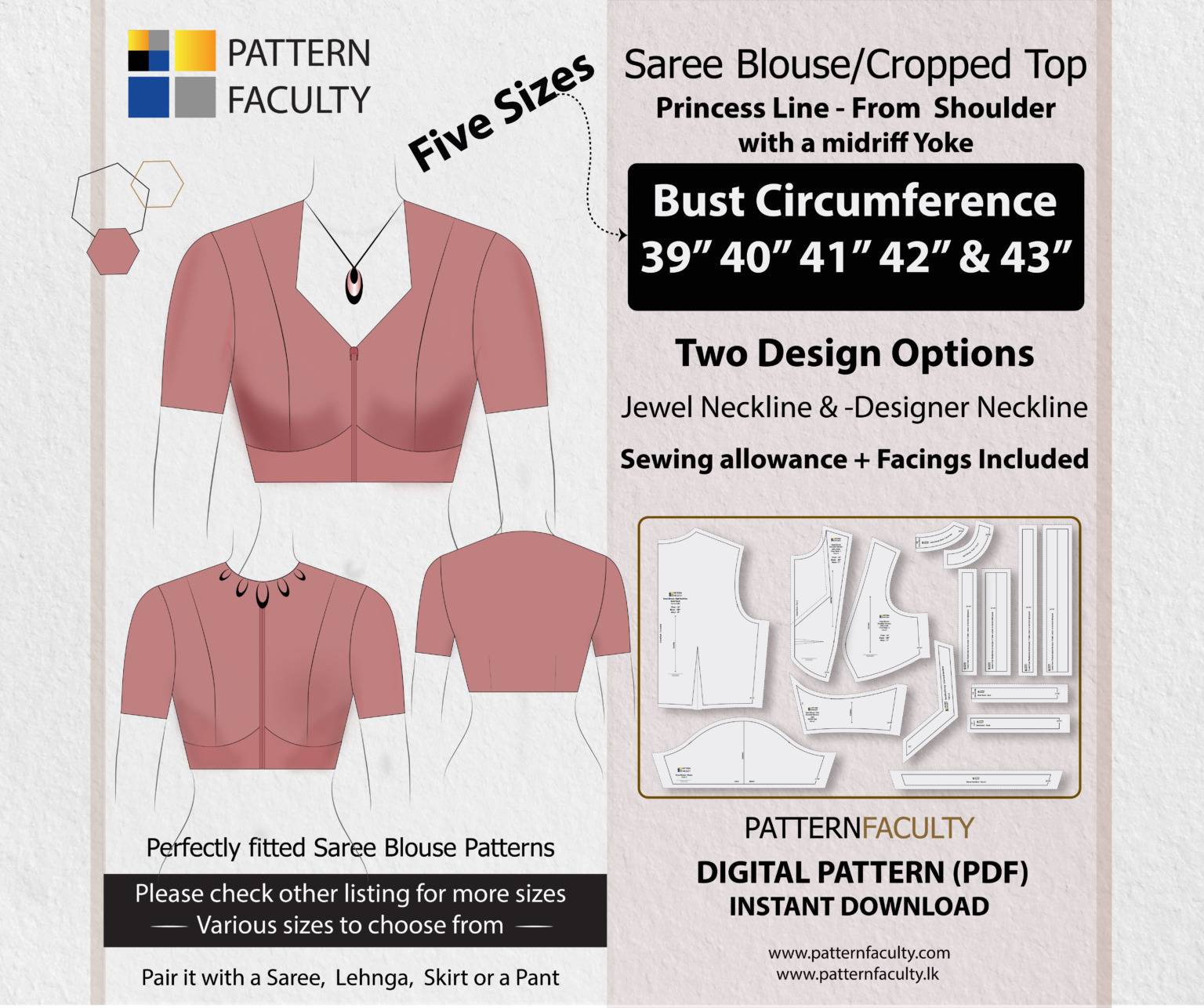 Elevate your fashion with our PDF Digital Pattern for a Saree Blouse featuring a stylish High neckline and an elegant Princess Line cut that flows from the mid-shoulder to the under bust and finishing with a beautiful midriff yoke. This pattern is designed to fit a range of sizes, accommodating bust circumferences 39, 40, 41, 42 & 43 inches. You can customize the blouse with a classic Jewel Neckline, a modern designer Neckline or give your own neckline design. The blouse harmoniously complements sarees, lehngas, skirts, or pants, enabling you to effortlessly fashion high-necked blouses that infuse a hint of sophistication into any attire. Feel free to embellish your saree blouse with piping, sequins, or any other decorative elements to elevate its beauty even further.