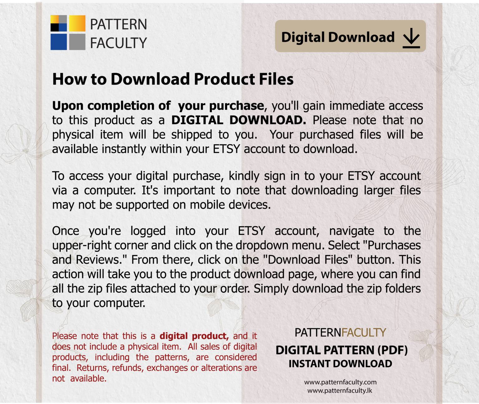 Instant Downloads: Once your payment is confirmed, you will have access to download the pattern files. Kindly ensure that you check both your Pattern Faculty-LK account and the email address associated with it for the download links.