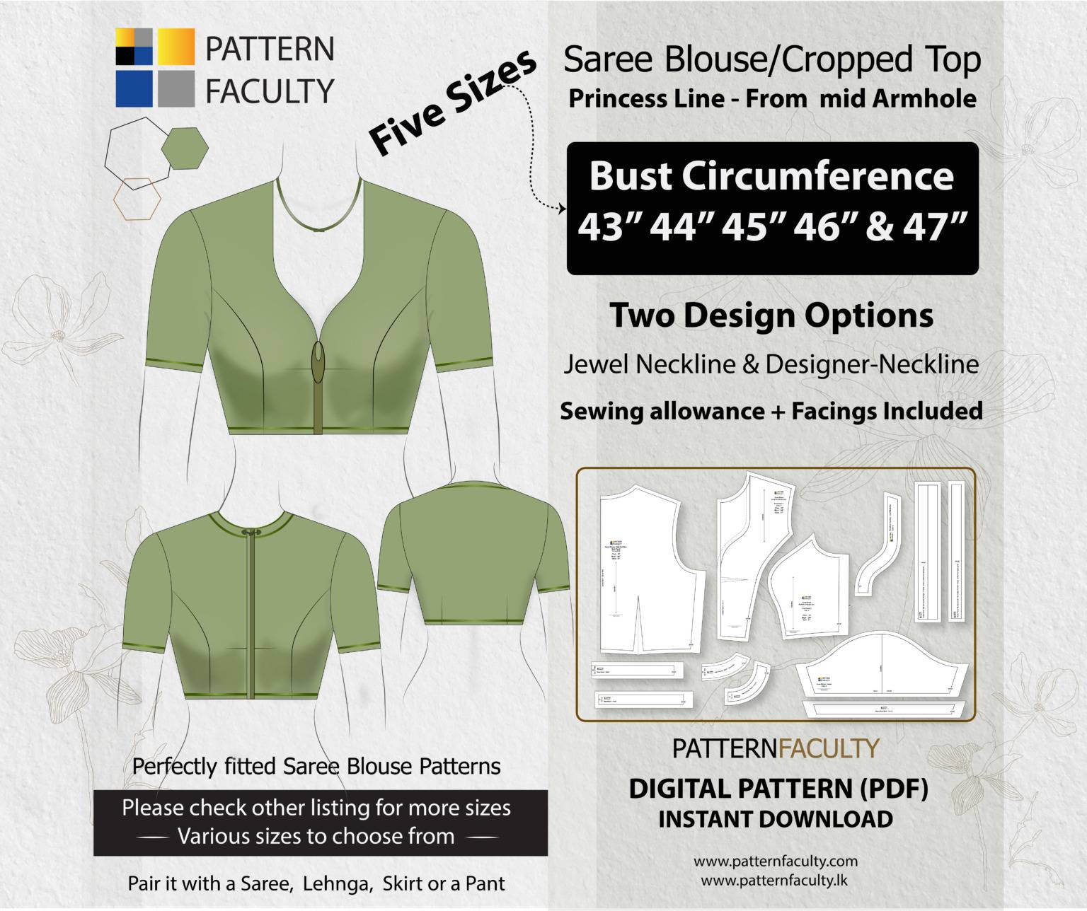 Elevate your fashion with our PDF Digital Pattern for a Saree Blouse featuring a stylish High neckline and an elegant Princess Line cut that flows from the mid-armhole to the waist. This pattern is designed to fit a range of sizes, accommodating bust circumferences 43, 44, 45, 46 and 47 inches. You can customize the blouse with a classic Jewel Neckline, a modern designer Neckline or give your own neckline design. The blouse harmoniously complements sarees, lehngas, skirts, or pants, enabling you to effortlessly fashion high-necked blouses that infuse a hint of sophistication into any attire. Feel free to embellish your saree blouse with piping, sequins, or any other decorative elements to elevate its beauty even further.