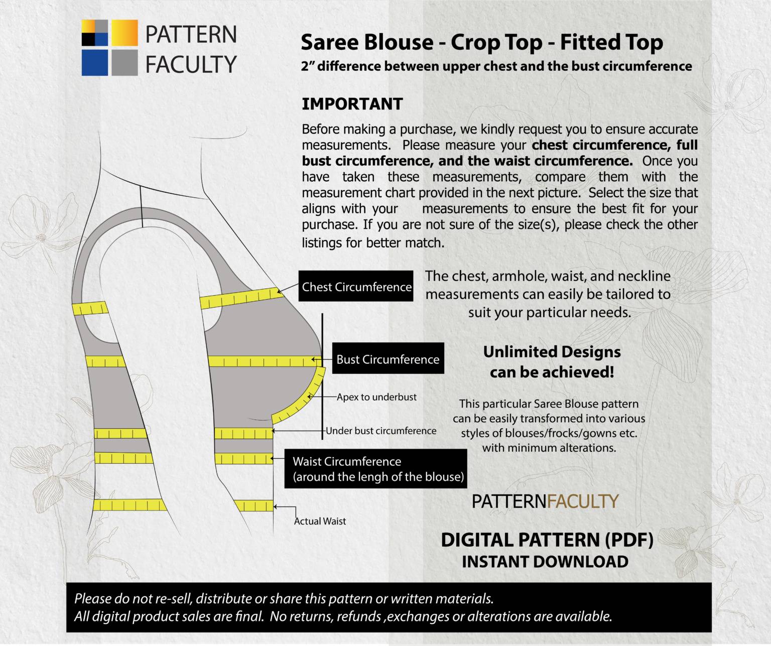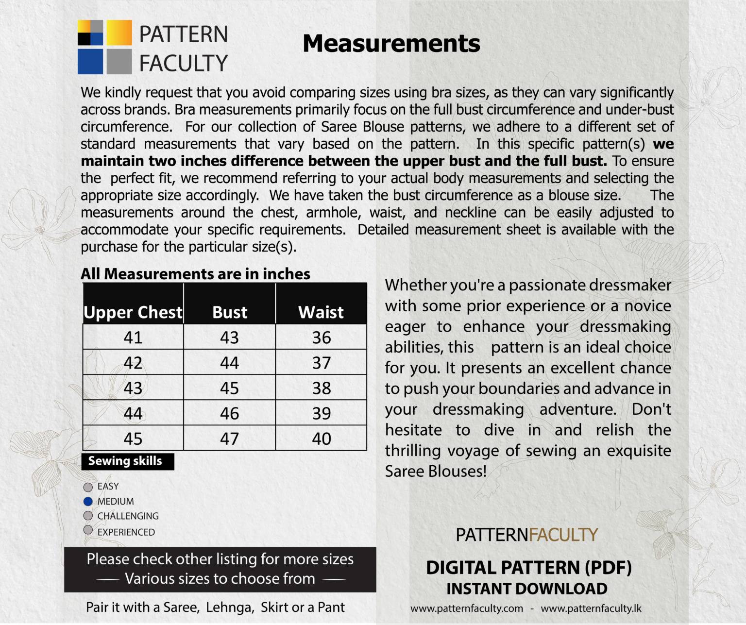 IMPORTANT MEASUREMENTS: This pattern set is drafted with a two-inch difference between the upper bust and bust circumference. Before making a purchase, we kindly request you to ensure accurate measurements. Please measure your chest circumference, full bust circumference, and the waist circumference. Once you have taken these measurements, compare them with the measurement chart provided below. If your body measurements do not align with any of these sizes mentioned below, kindly consider checking out alternative size group options available here. We have sizes from Bust circumference 31 to 55 available in this range.