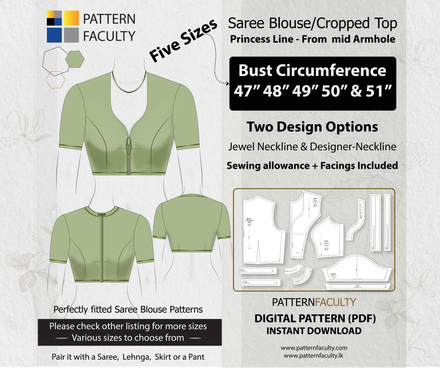 Elevate your fashion with our PDF Digital Pattern for a Saree Blouse featuring a stylish High neckline and an elegant Princess Line cut that flows from the mid-armhole to the waist. This pattern is designed to fit a range of sizes, accommodating bust circumferences 47, 48, 49, 50 and 51 inches. You can customize the blouse with a classic Jewel Neckline, a modern designer Neckline or give your own neckline design. The blouse harmoniously complements sarees, lehngas, skirts, or pants, enabling you to effortlessly fashion high-necked blouses that infuse a hint of sophistication into any attire. Feel free to embellish your saree blouse with piping, sequins, or any other decorative elements to elevate its beauty even further.