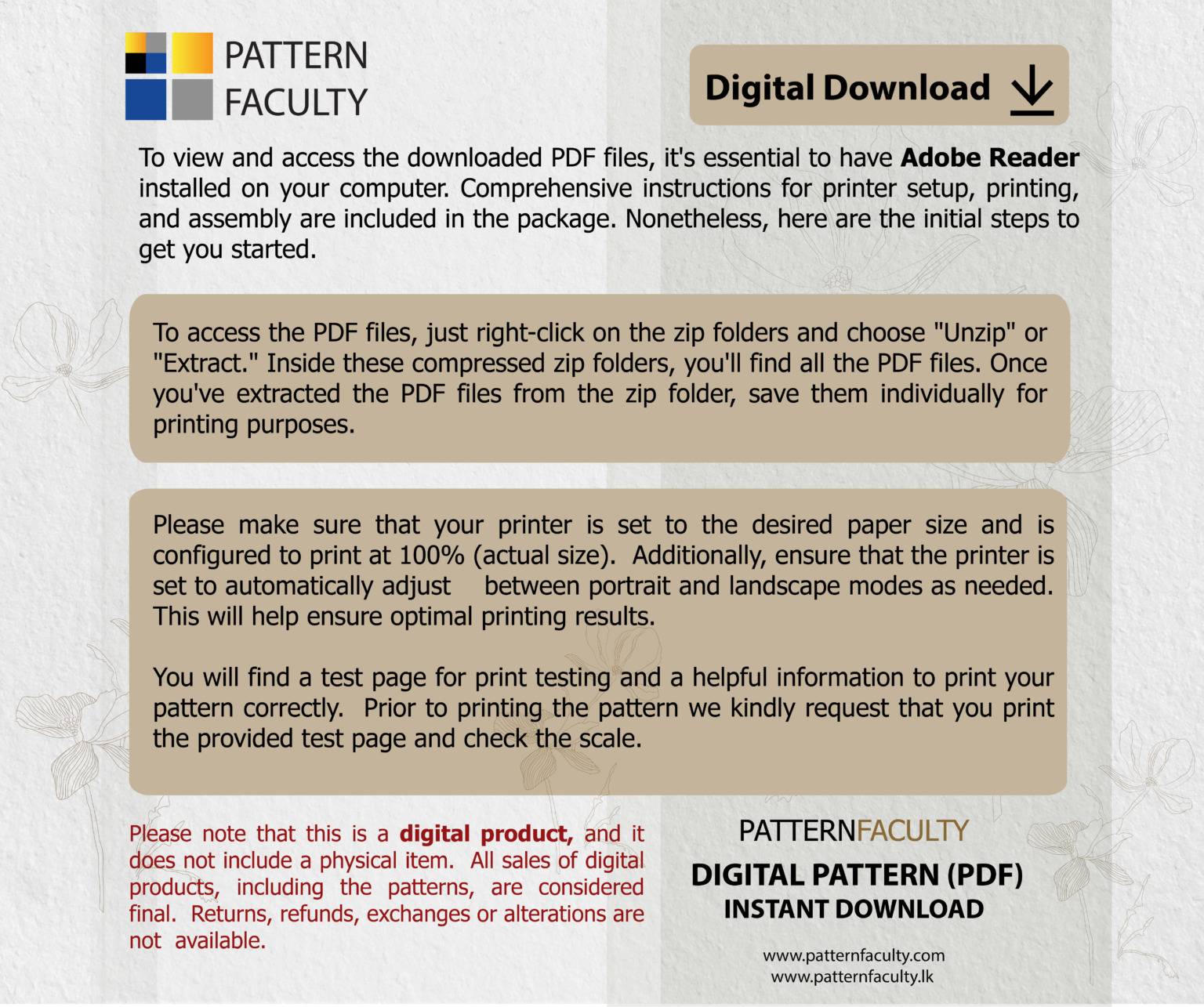Instant Downloads: Once your payment is confirmed, you will have access to download the pattern files. Kindly ensure that you check both your Pattern Faculty-LK account and the email address associated with it for the download links.