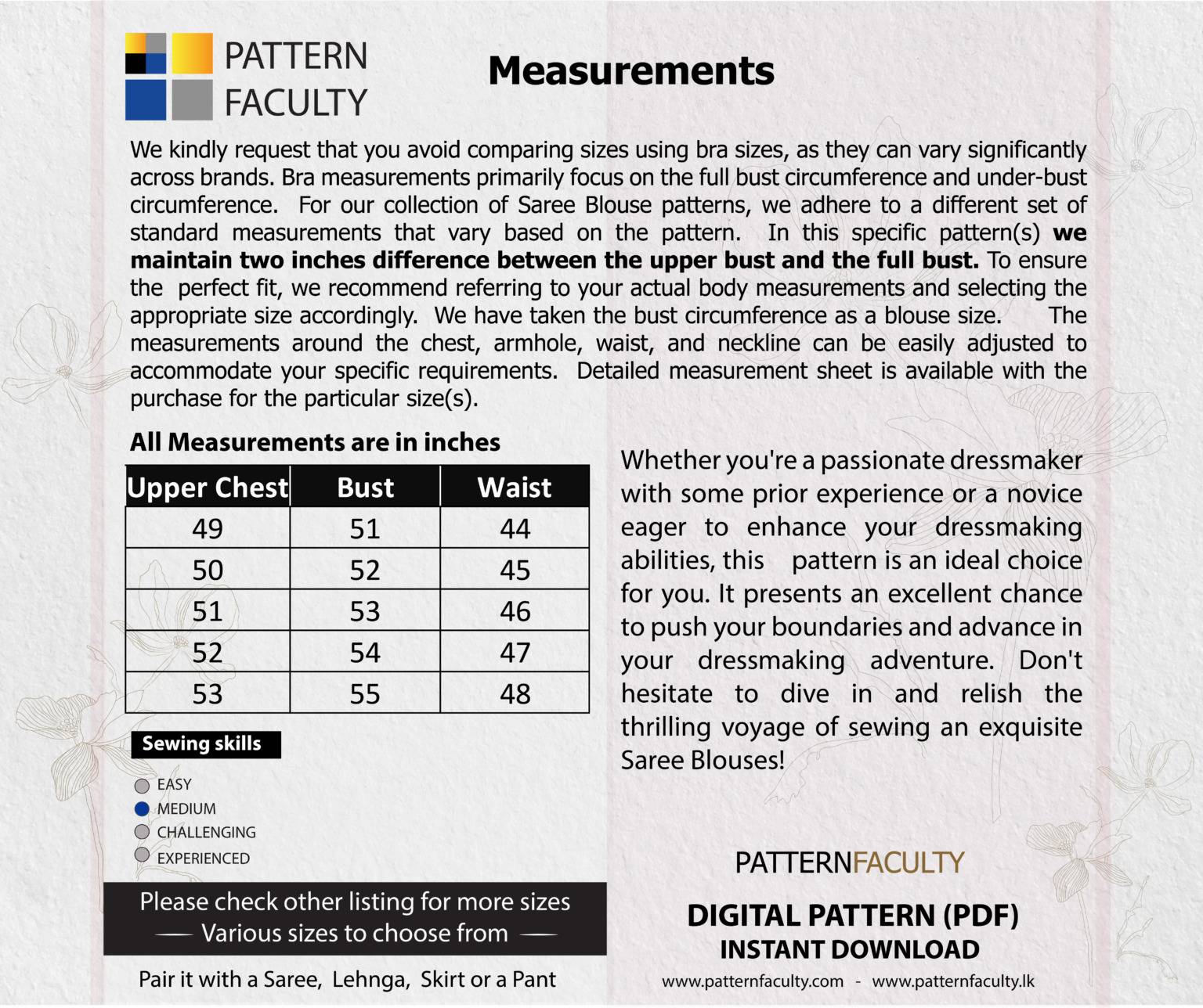IMPORTANT MEASUREMENTS: This pattern set is drafted with a two-inch difference between the upper bust and bust circumference. Before making a purchase, we kindly request you to ensure accurate measurements. Please measure your chest circumference, full bust circumference, and the waist circumference. Once you have taken these measurements, compare them with the measurement chart provided below. If your body measurements do not align with any of these sizes mentioned below, kindly consider checking out alternative size group options available here. We have sizes from Bust circumference 31 to 55 available in this range.