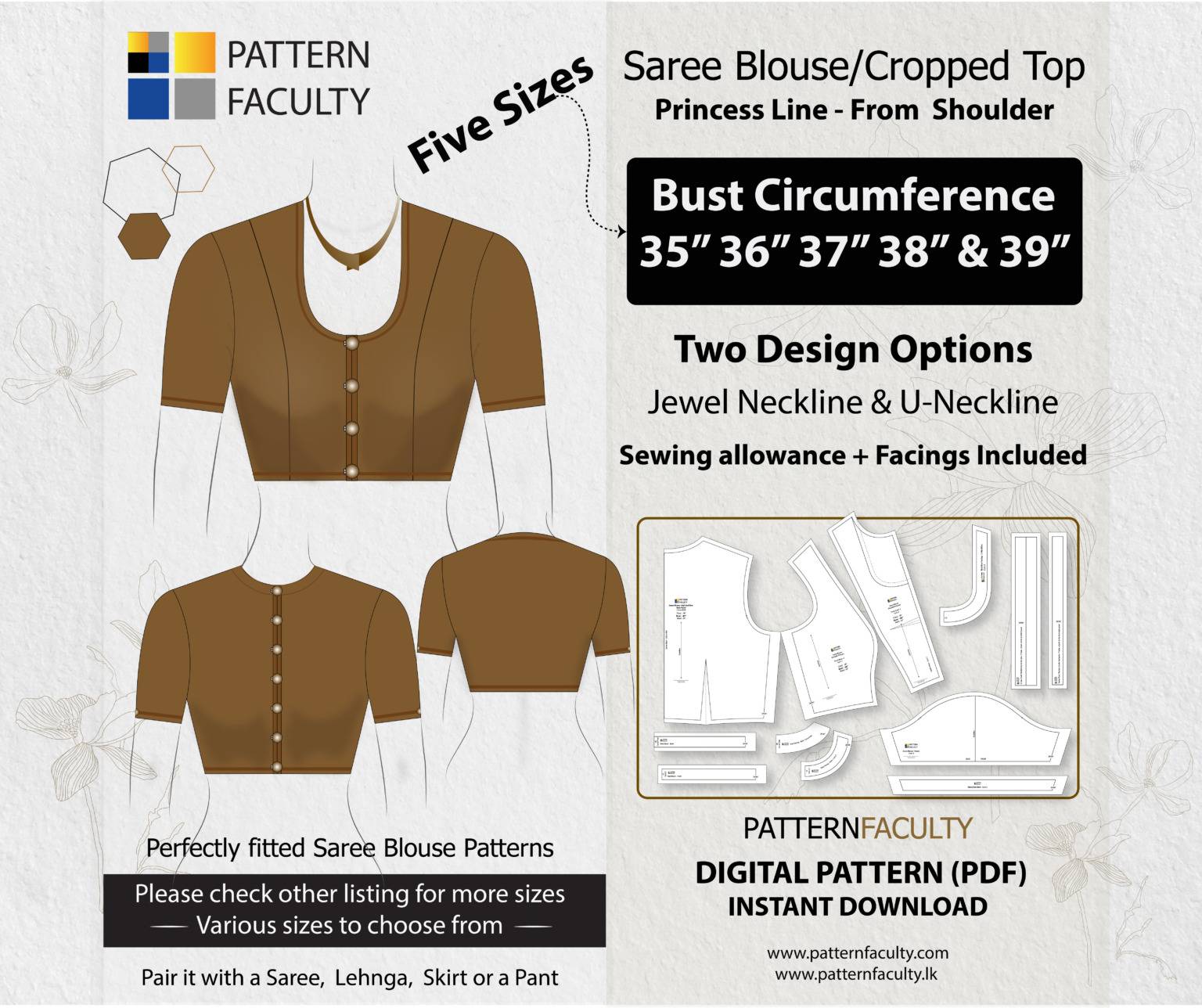 Saree Blouse High Neckline Digital Pattern Princess Line from Shoulder One Design with two options (Jewel Neckline and U-neckline) Sizes Bust circumference 35, 36, 37, 38 and 39 PDF Digital Pattern for a High-Neck Saree Blouse (Crop Top/Fitted Top) Your Gateway to Elegant Style.