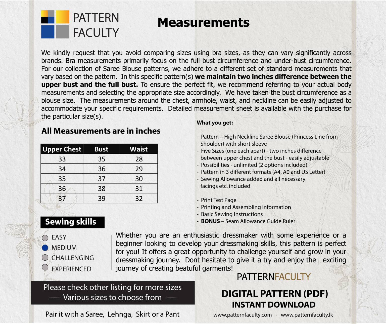 IMPORTANT MEASUREMENTS: This pattern set is drafted with a two-inch difference between the upper bust and bust circumference. Before making a purchase, we kindly request you to ensure accurate measurements. Please measure your chest circumference, full bust circumference, and the waist circumference. Once you have taken these measurements, compare them with the measurement chart provided below. If your body measurements do not align with any of these sizes mentioned below, kindly consider checking out alternative size group options available here. We have sizes from Bust circumference 31 to 55 available in this range.