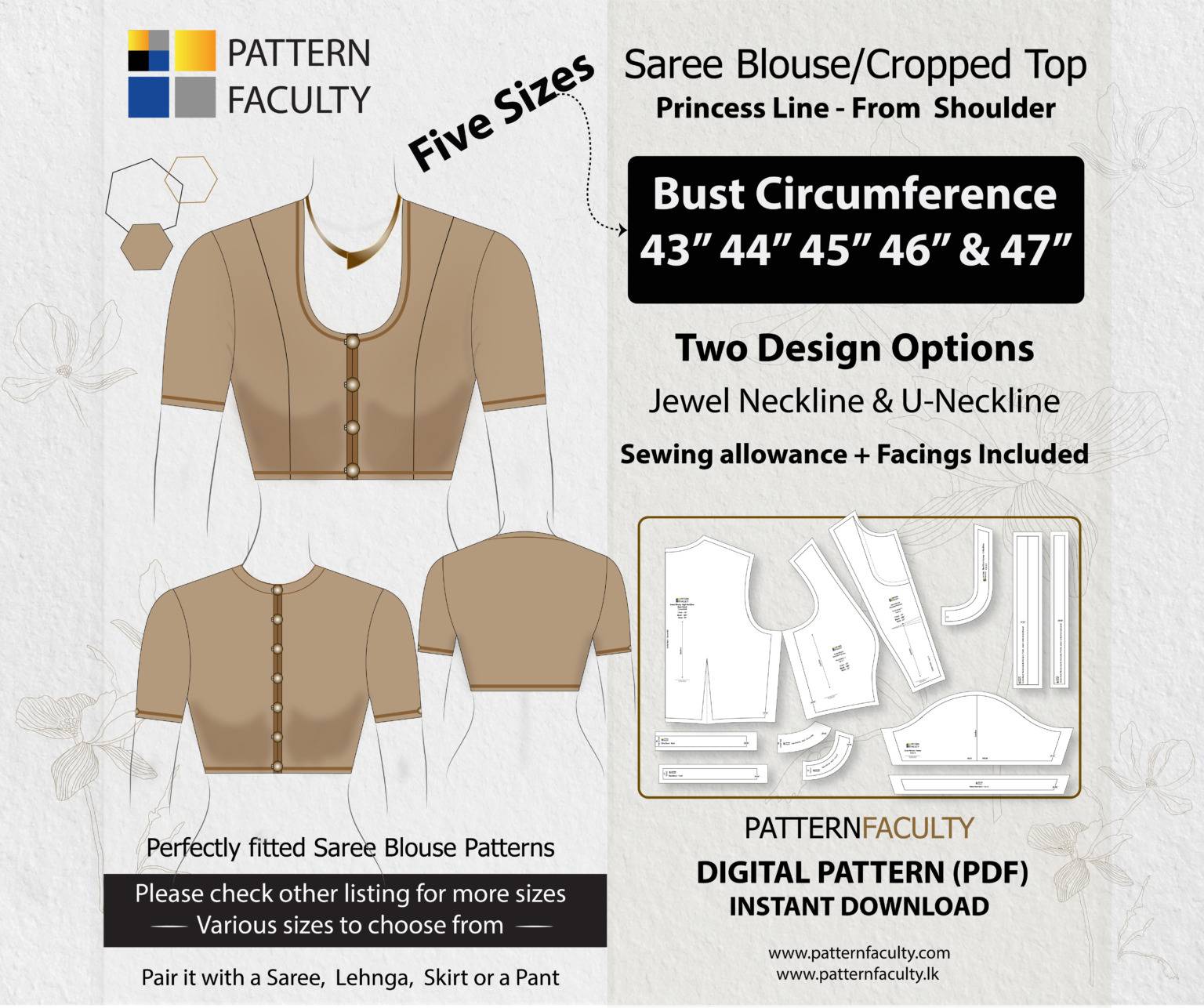 Saree Blouse High Neckline Digital Pattern Princess Line from Shoulder One Design with two options (Jewel Neckline and U-neckline) Sizes Bust circumference 43, 44, 45, 46 and 47 PDF Digital Pattern for a High-Neck Saree Blouse (Crop Top/Fitted Top) Your Gateway to Elegant Style.