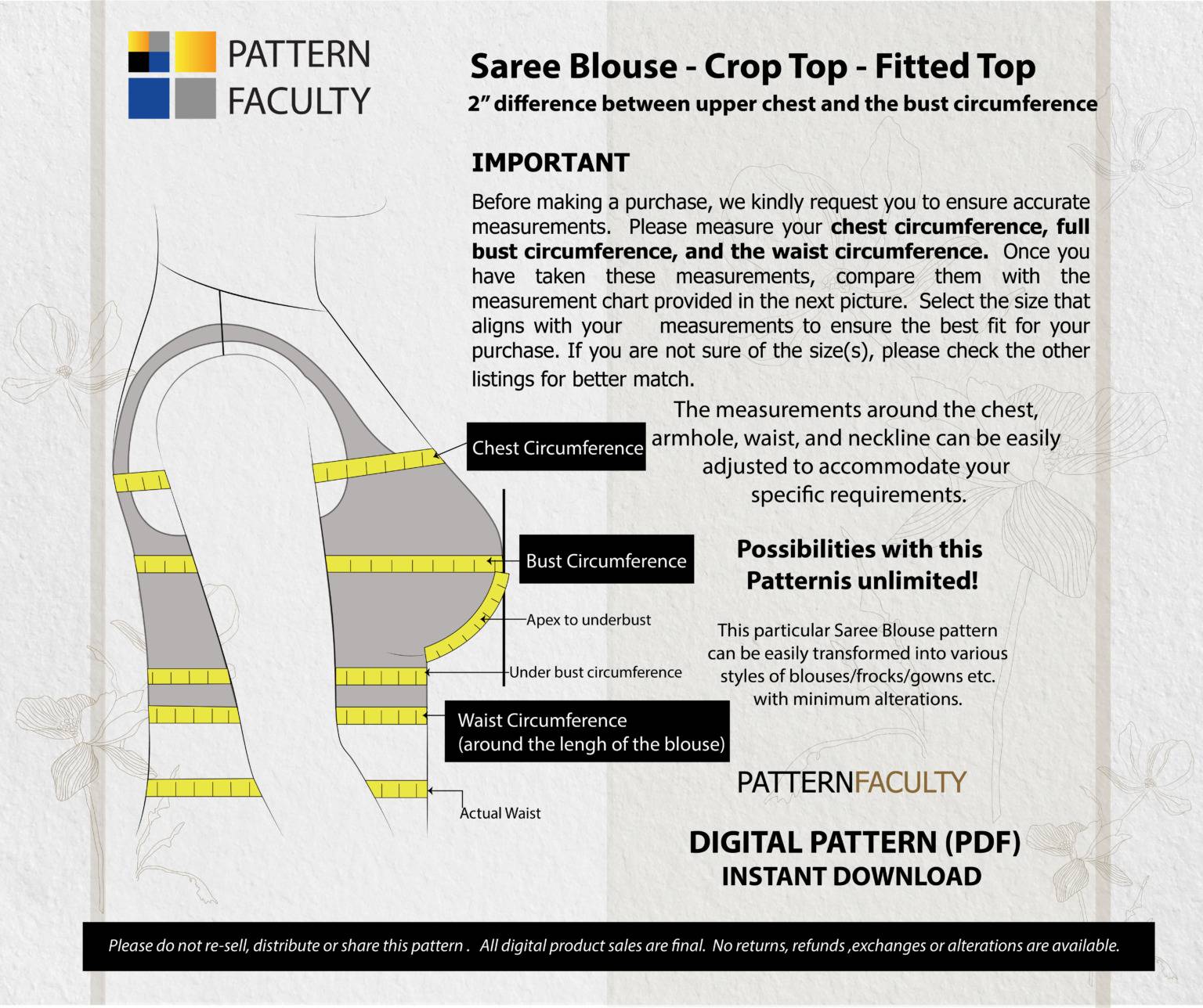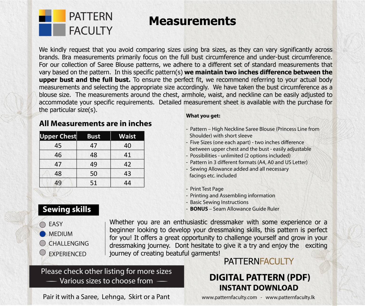 IMPORTANT MEASUREMENTS: This pattern set is drafted with a two-inch difference between the upper bust and bust circumference. Before making a purchase, we kindly request you to ensure accurate measurements. Please measure your chest circumference, full bust circumference, and the waist circumference. Once you have taken these measurements, compare them with the measurement chart provided below. If your body measurements do not align with any of these sizes mentioned below, kindly consider checking out alternative size group options available here. We have sizes from Bust circumference 31 to 55 available in this range.
