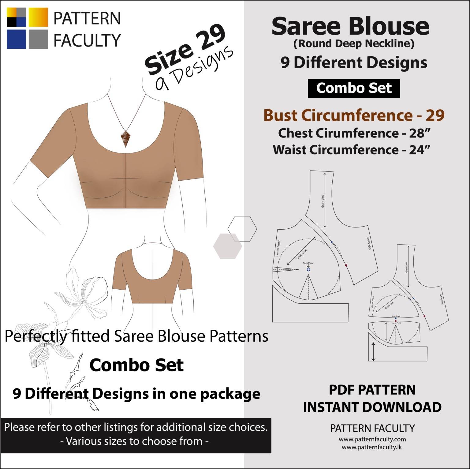 Saree Blouses Round Deep Neckline – Size 29 – 9 Styles Sari Blouses – Sabyasachi-Single Katori-Double Katori-Princess Line-Three Darted-Four Darted pdf Patterns.