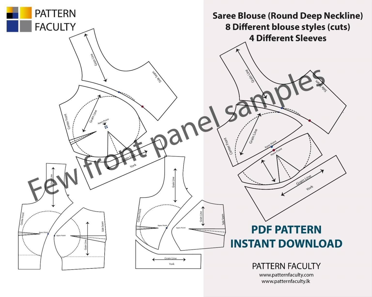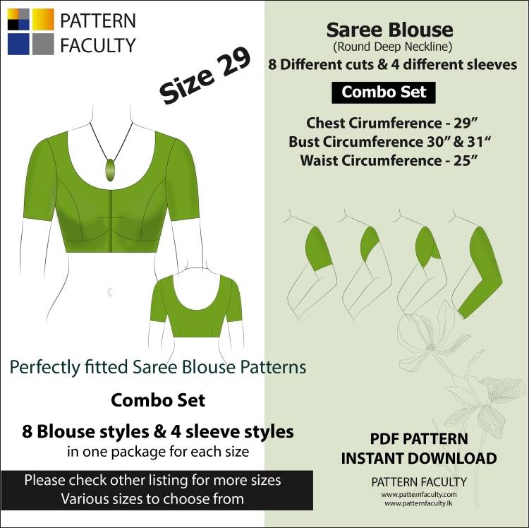 Pair any of these beautiful Deep Neckline Blouses with your favorite Saree, Lehnga, Skirt or Pant. There are 8 different designs of blouses and 4 different designs of sleeve patterns in this MEGA package. All the designs are displayed in the video clip.