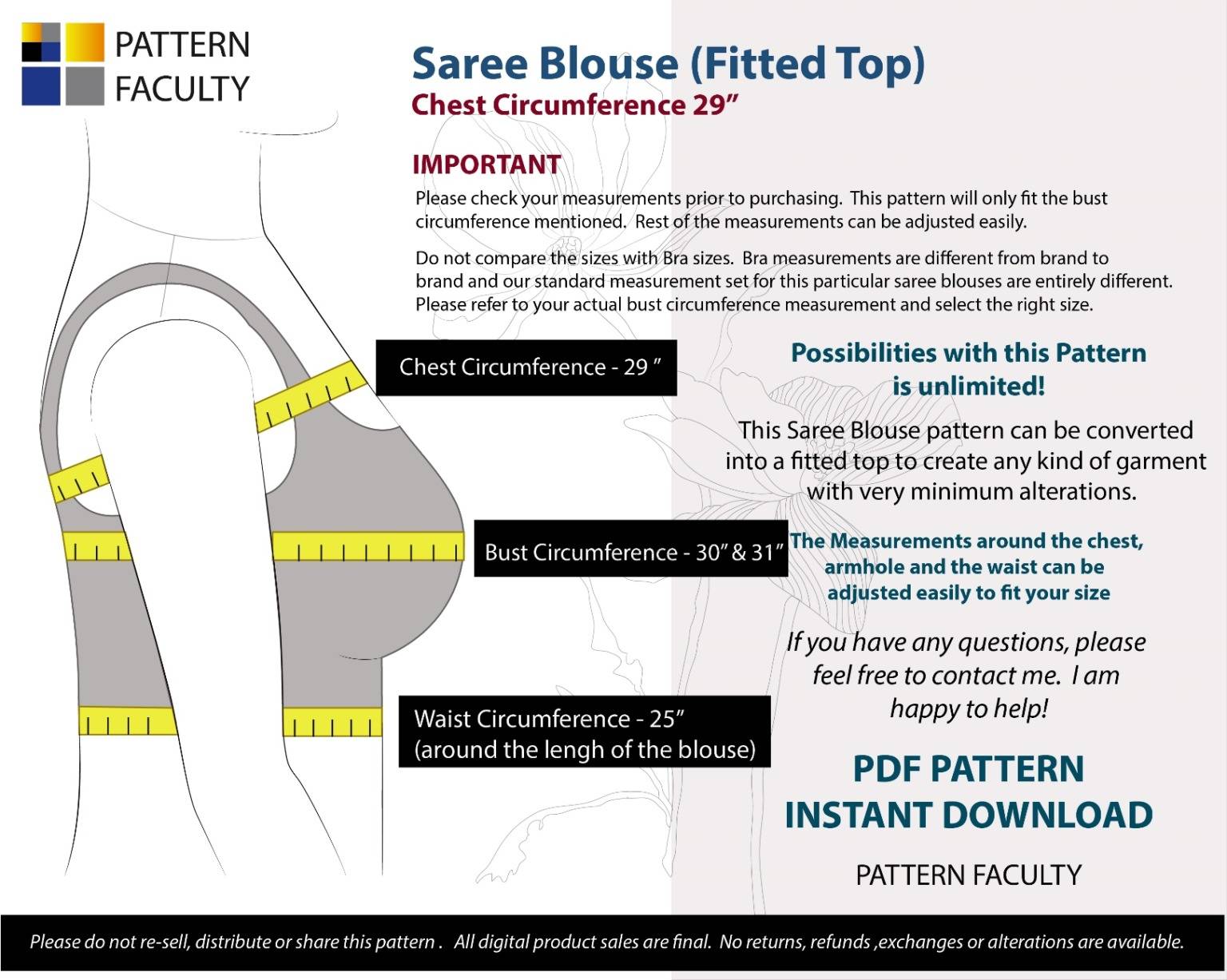 IMPORTANT: Please note that these blouses are coming to you with no sewing allowance or facings. You can easily add whatever amount of sewing allowance you are comfortable with. Basic Instructions are provided how to add sewing allowance and the facings. As a bonus, you will also will get a Sewing Allowance Guide Ruler.