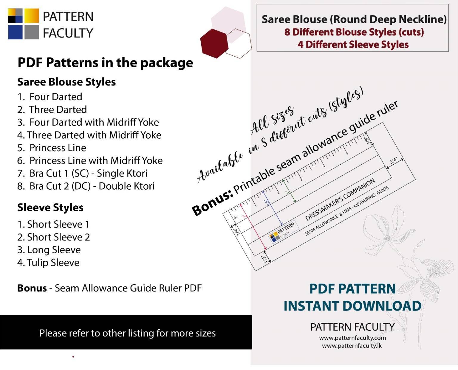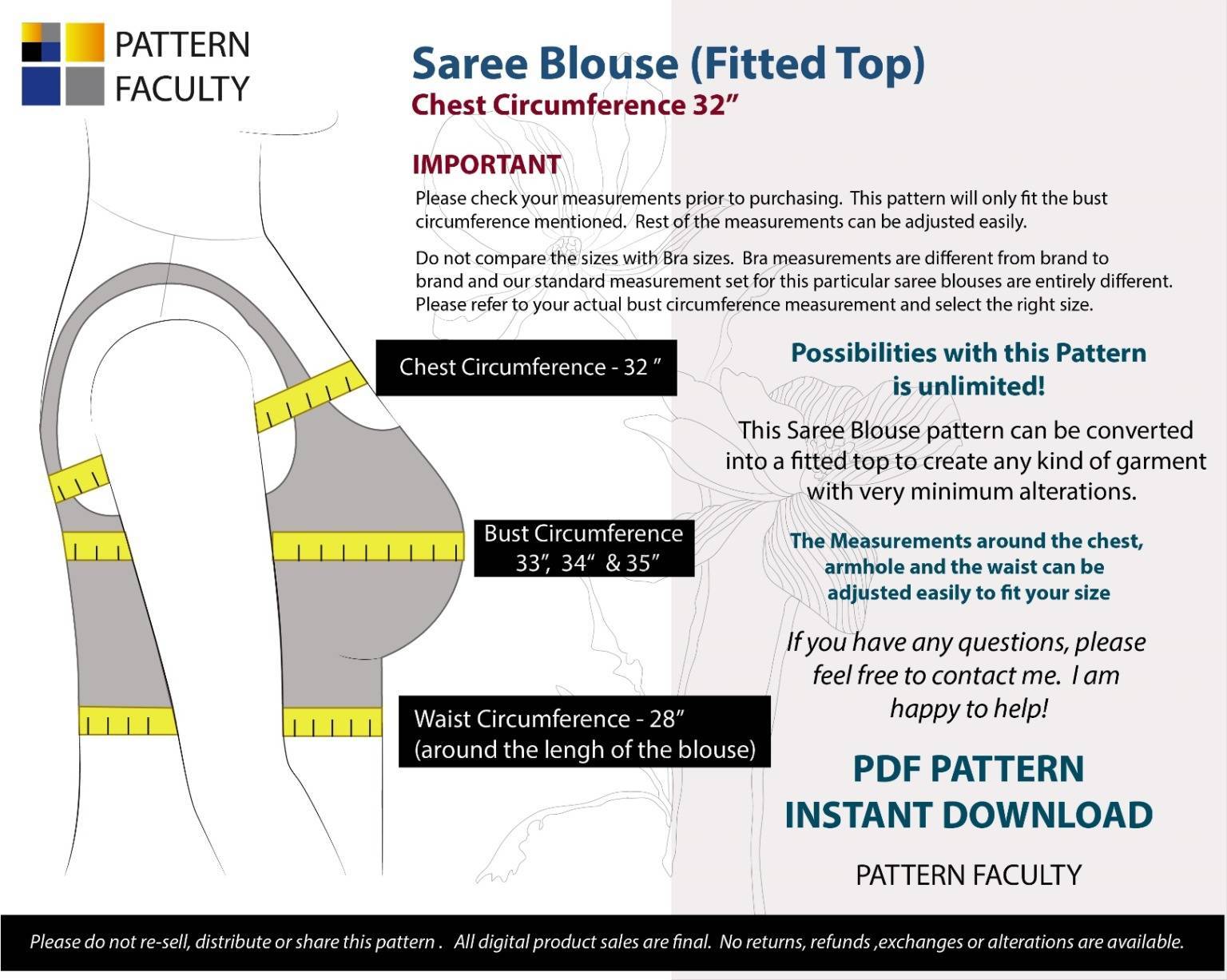 IMPORTANT: Please note that these blouses are coming to you with no sewing allowance or facings. You can easily add whatever amount of sewing allowance you are comfortable with. Basic Instructions are provided how to add sewing allowance and the facings. As a bonus, you will also will get a Sewing Allowance Guide Ruler.