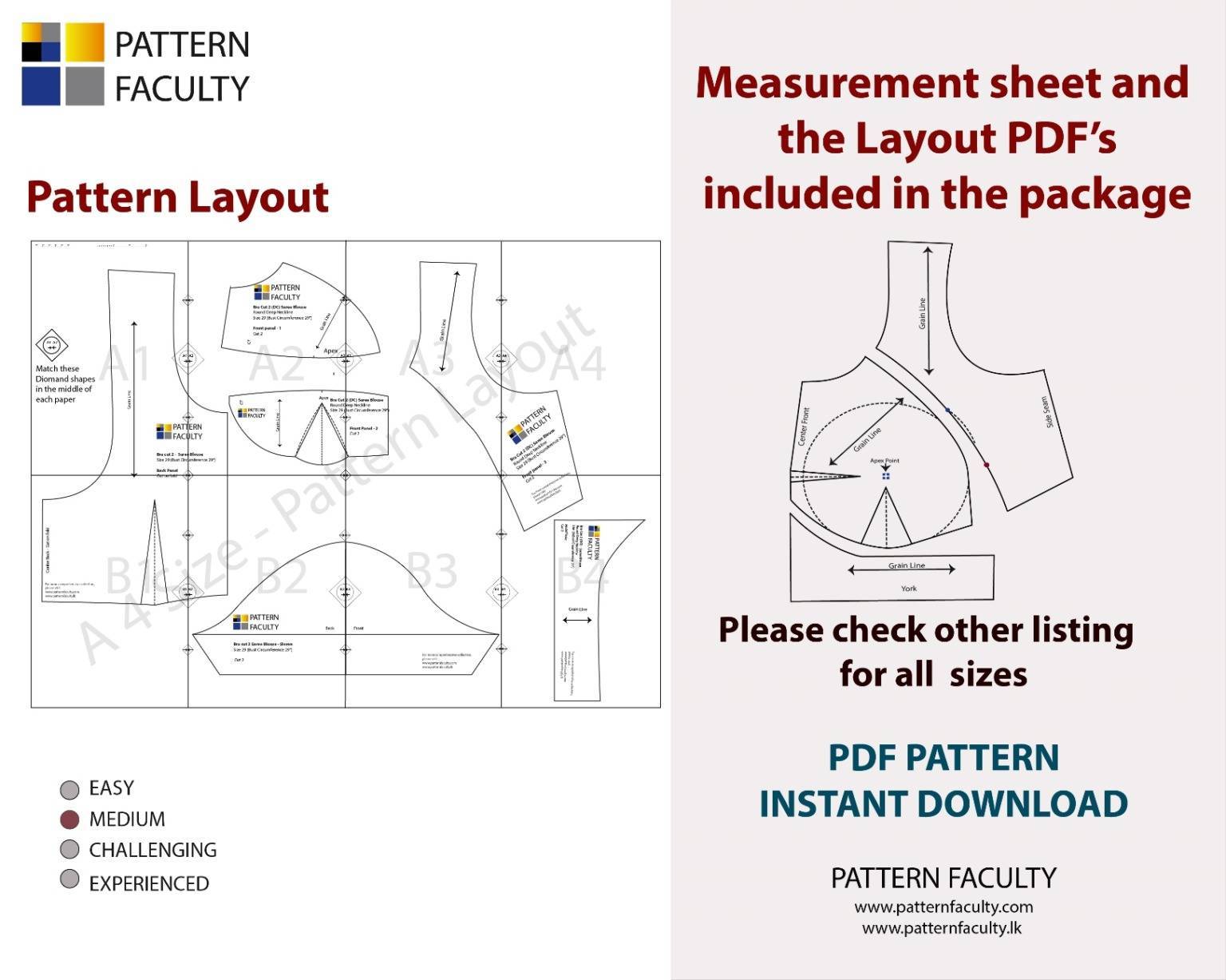 Printing: You have two options for printing your downloaded pattern. The first option is to print it using your home printer. Alternatively, you can choose to have it printed at a local printing shop. Please note that in order to view these files, you will need to have Adobe Reader installed on your computer. These files are compressed in a zip format, and you’ll need to extract them to access your PDF documents. Once you purchase the pattern, you will be provided with detailed instructions on how to set up your printer, assemble the A4 size or US letter size pattern papers, and also basic sewing instructions.