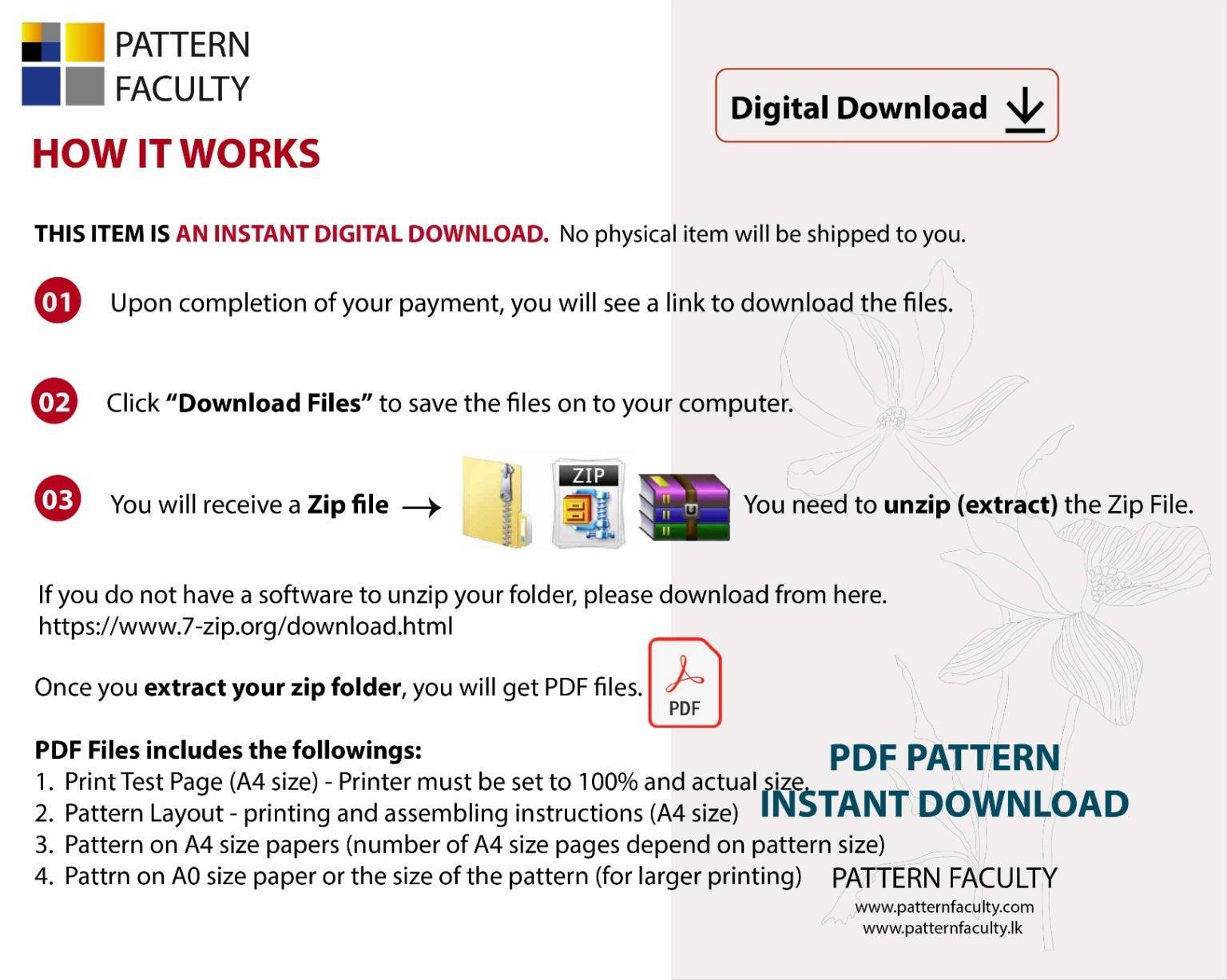 Instant Downloads: Once your payment is confirmed, you will have access to download the pattern files. Kindly ensure that you check both your Pattern Faculty-LK account and the email address associated with it for the download links.