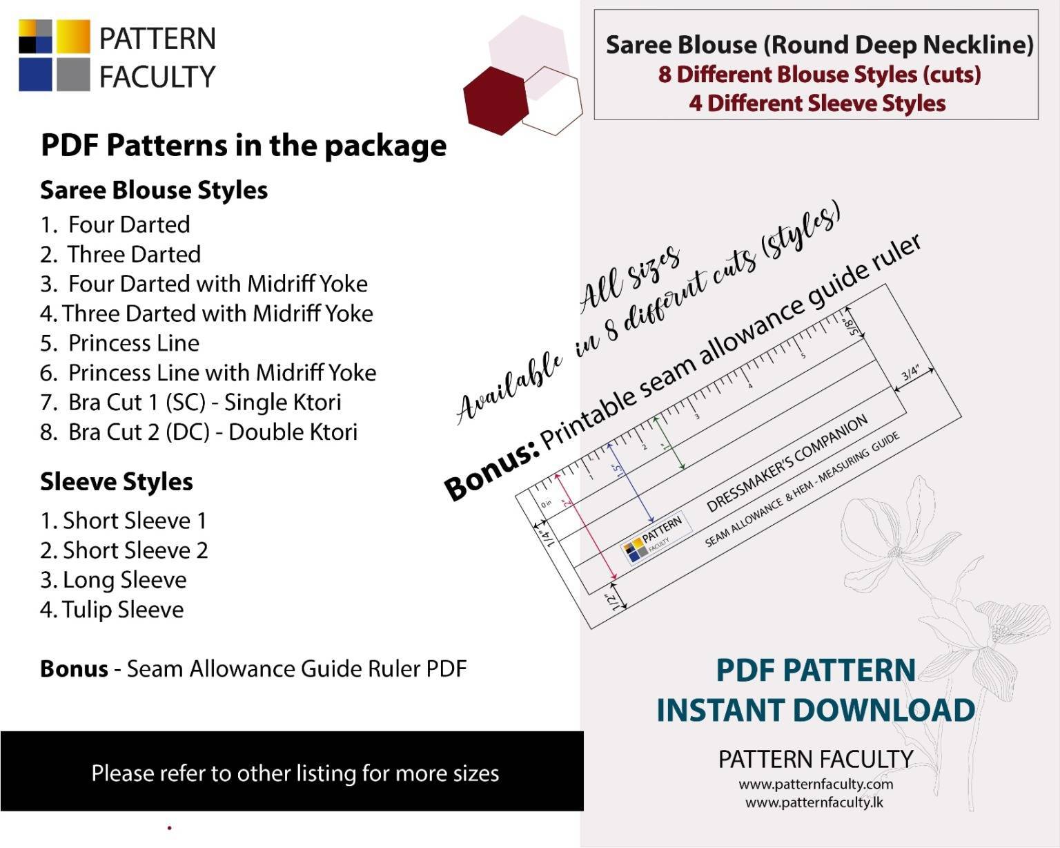 IMPORTANT: Please note that these blouses are coming to you with no sewing allowance or facings. You can easily add whatever amount of sewing allowance you are comfortable with. Basic Instructions are provided how to add sewing allowance and the facings. As a bonus, you will also will get a Sewing Allowance Guide Ruler.