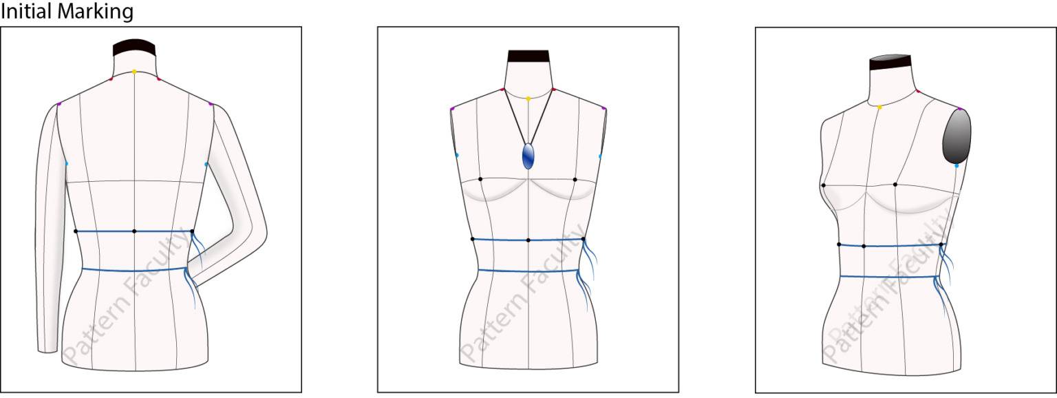 - Apex Points: Identify and mark the highest points of the bust on both apex points. This can be accomplished by stretching a ribbon across the bust points, ensuring it lightly touches the bust point, or alternatively, you can ask the model to directly indicate the apex point.