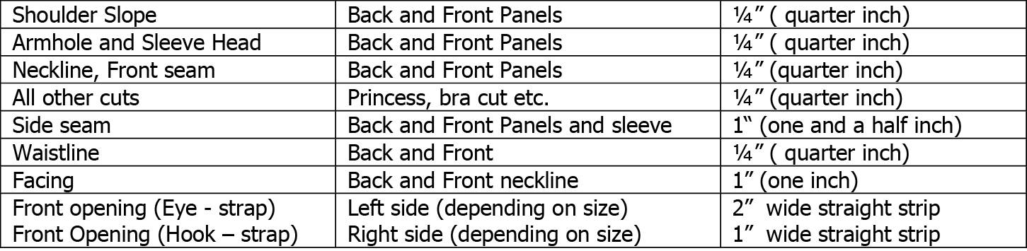 Please note that not all our patterns include sewing allowance and facings. The product descriptions of each and every item clearly indicate whether sewing allowance or facings are included within the pattern. In the event that your pattern requires sewing allowance or facings, you have the option to utilize the minimum allowances provided below or make adjustments based on your individual preferences. To make it easier to handle while sewing, it is recommended to cut your facings approximately an inch longer. Excess fabric can be cut off later.