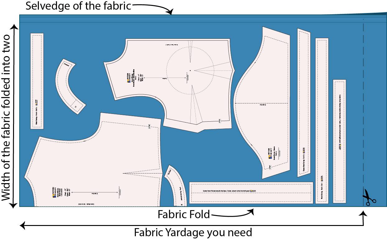 As we are working with a front open blouse pattern, we will be positioning the back panel on the fold. If you happen to have a back opening blouse, ensure that you position the front piece on the fold. Please note that certain pieces may require just a single piece. Refer to the example of pattern layout on fabric provided below: