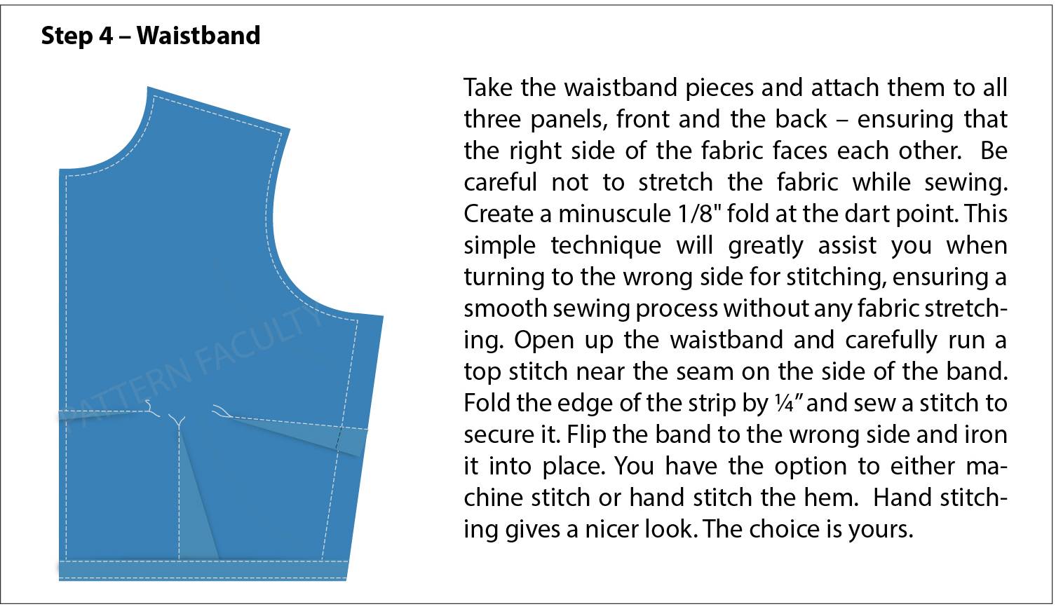 - Attach the waistband facings to the front and back of the blouse.